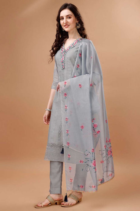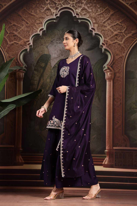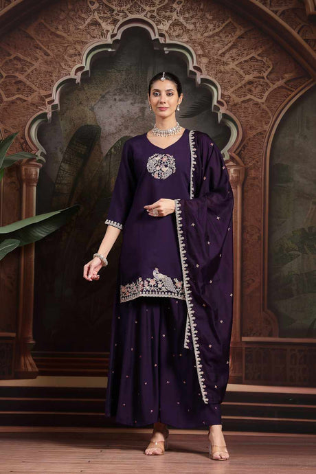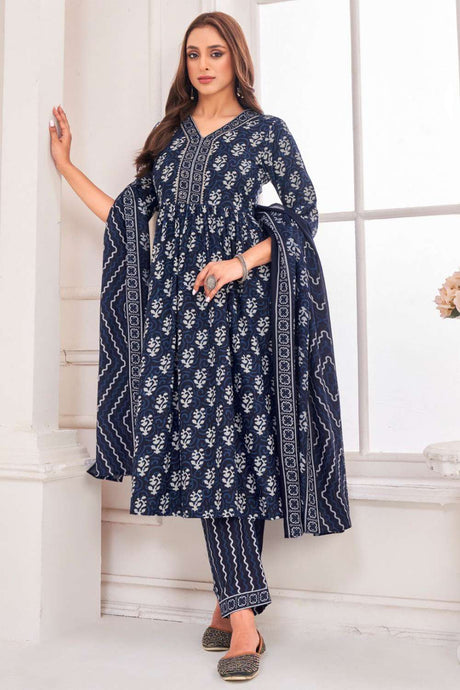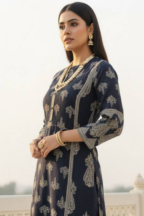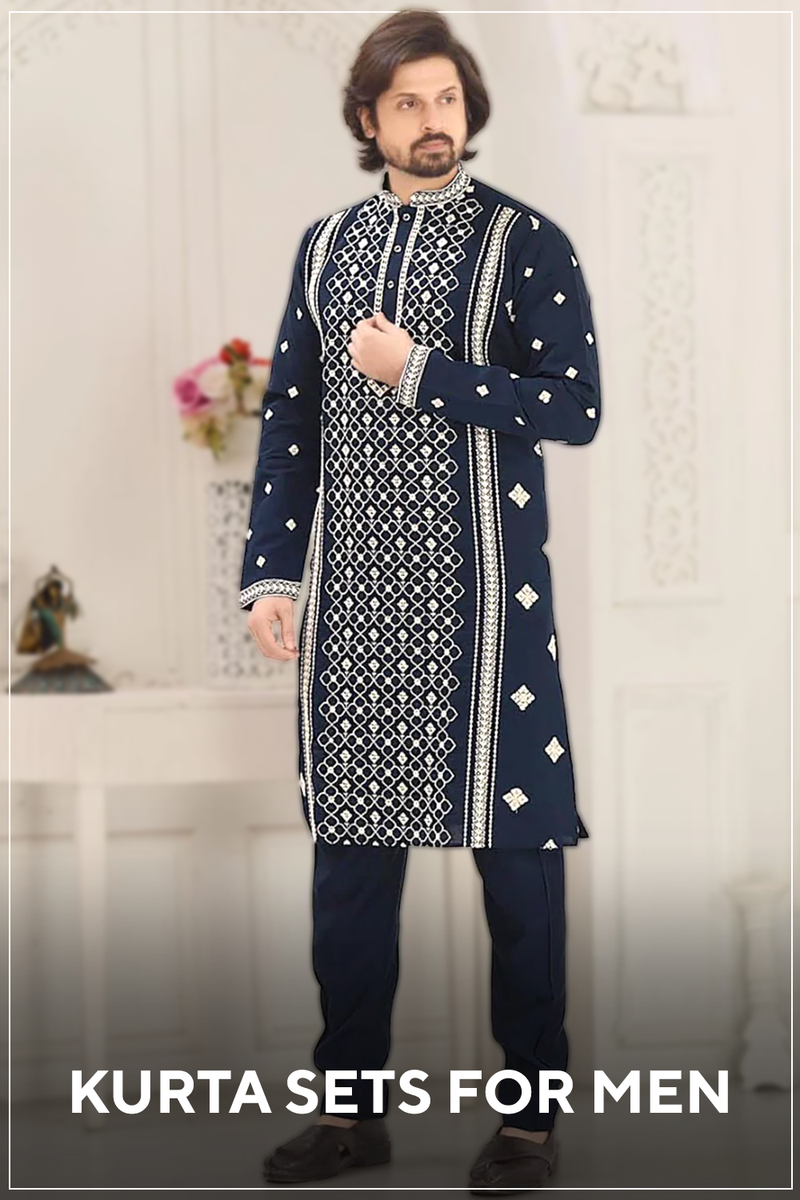 Men's Dark Blue Cotton Silk Embroidered Full Sleeves Short Kurta