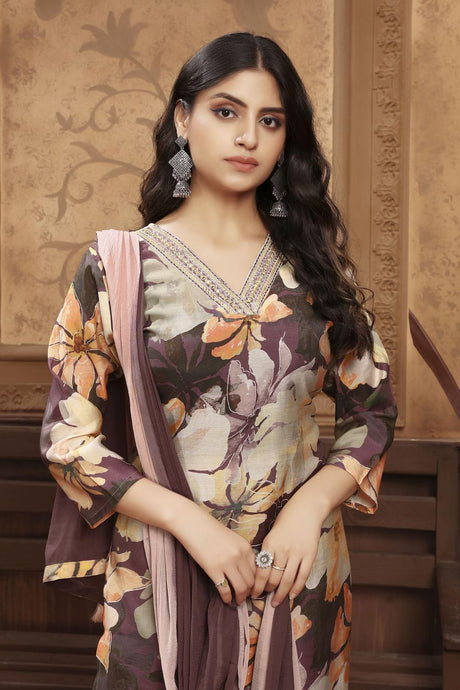 Brown Floral Embroidered Cotton Kurti Palazzo Set (WM27-BROWN)
