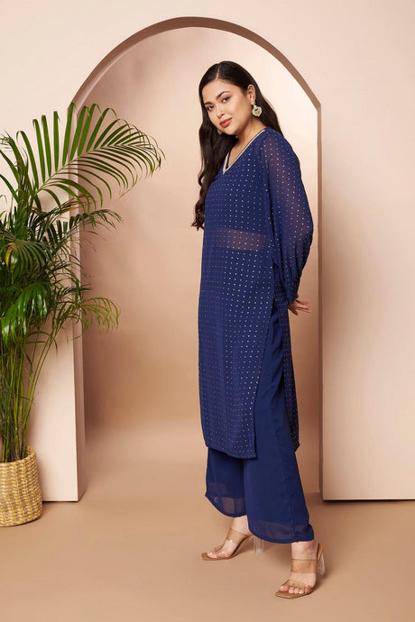 Navy Blue Polka Dot Georgette Kurti Palazzo Set (AHKUPZTP-COMBO-1167)
