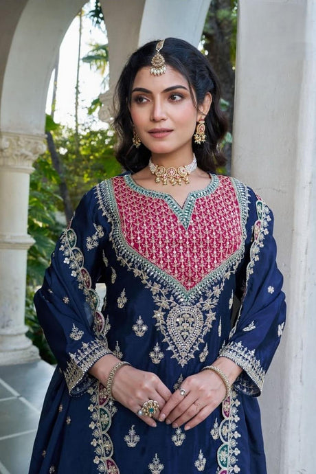 Navy Blue Embroidered Chinon Palazzo Suits (RF30268)