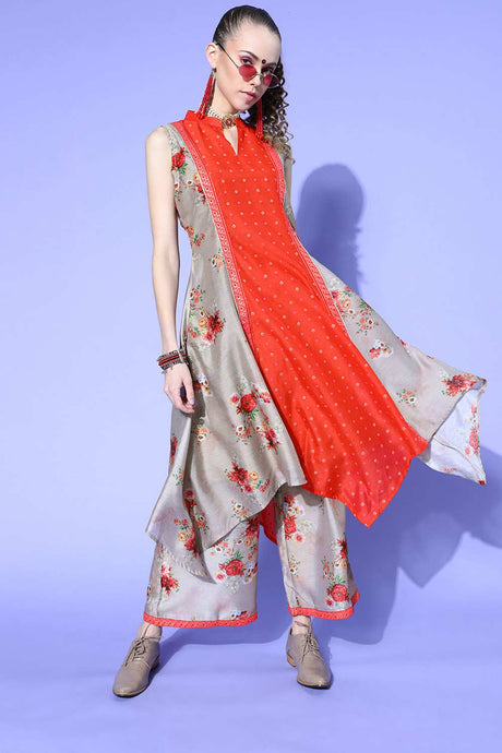 Girls Grey Chanderi Silk Pigment Print Kids Front Slit Kurta Dress