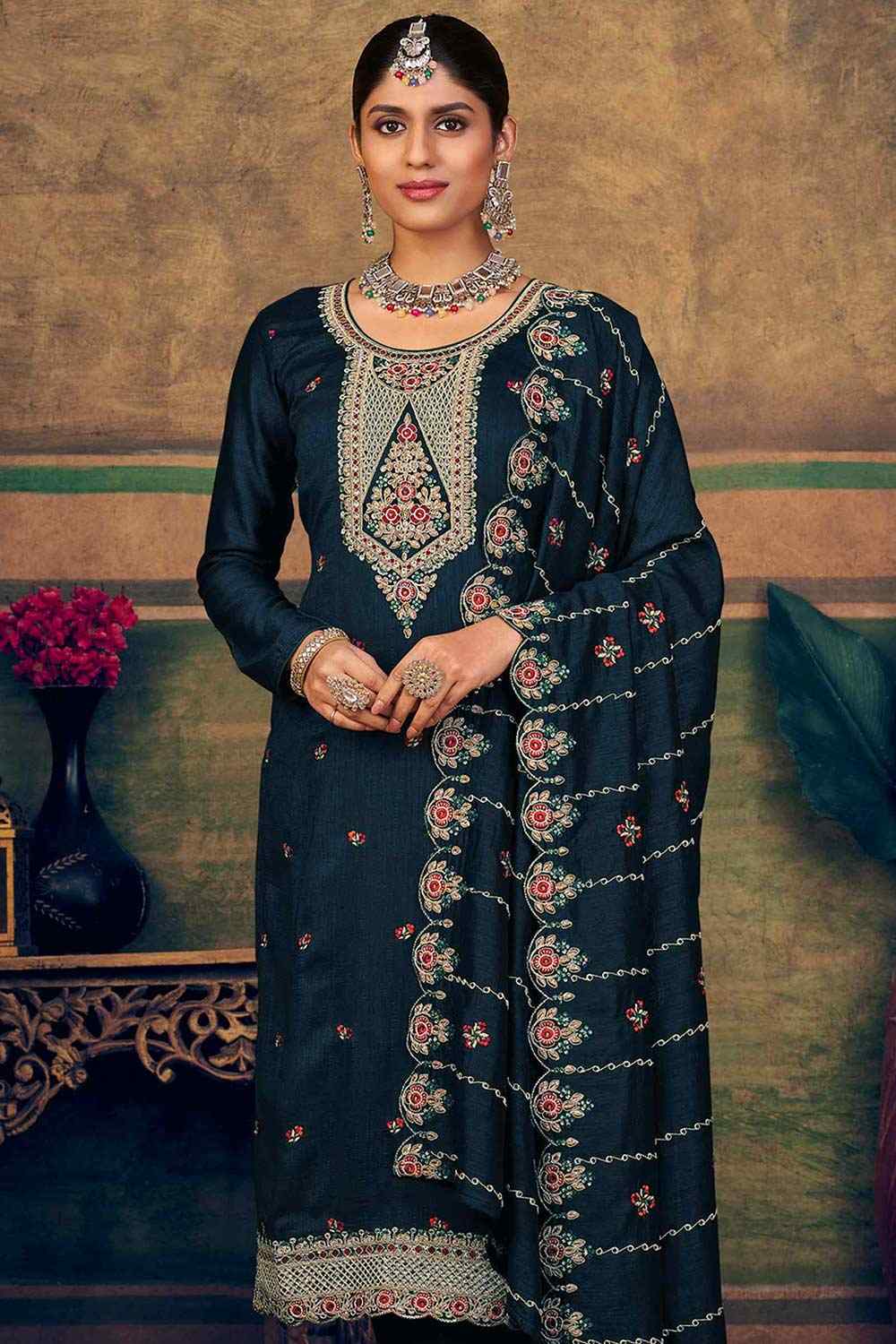 Navy Blue Pure Silk Embroidered Straight Cut Suit Set
