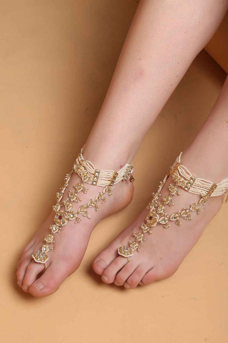 Gold And White Adjustable Anklet With Kundan And Pearls
