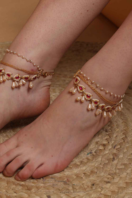 Red And Gold Adjustable Anklet With Kundan And Pearls