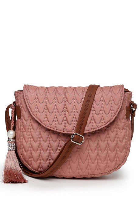 Coral And Tan Polyester And Vegan Leather Chevron Quilted Sling Bag