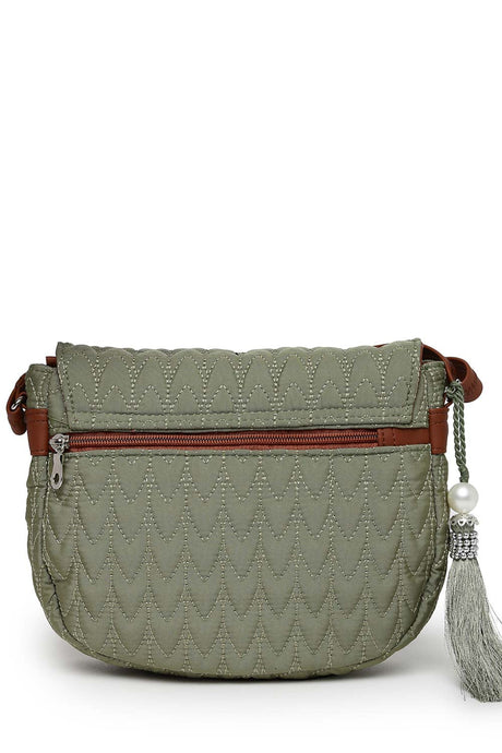 Olive Green And Tan Polyester And Vegan Leather Chevron Quilted Sling Bag