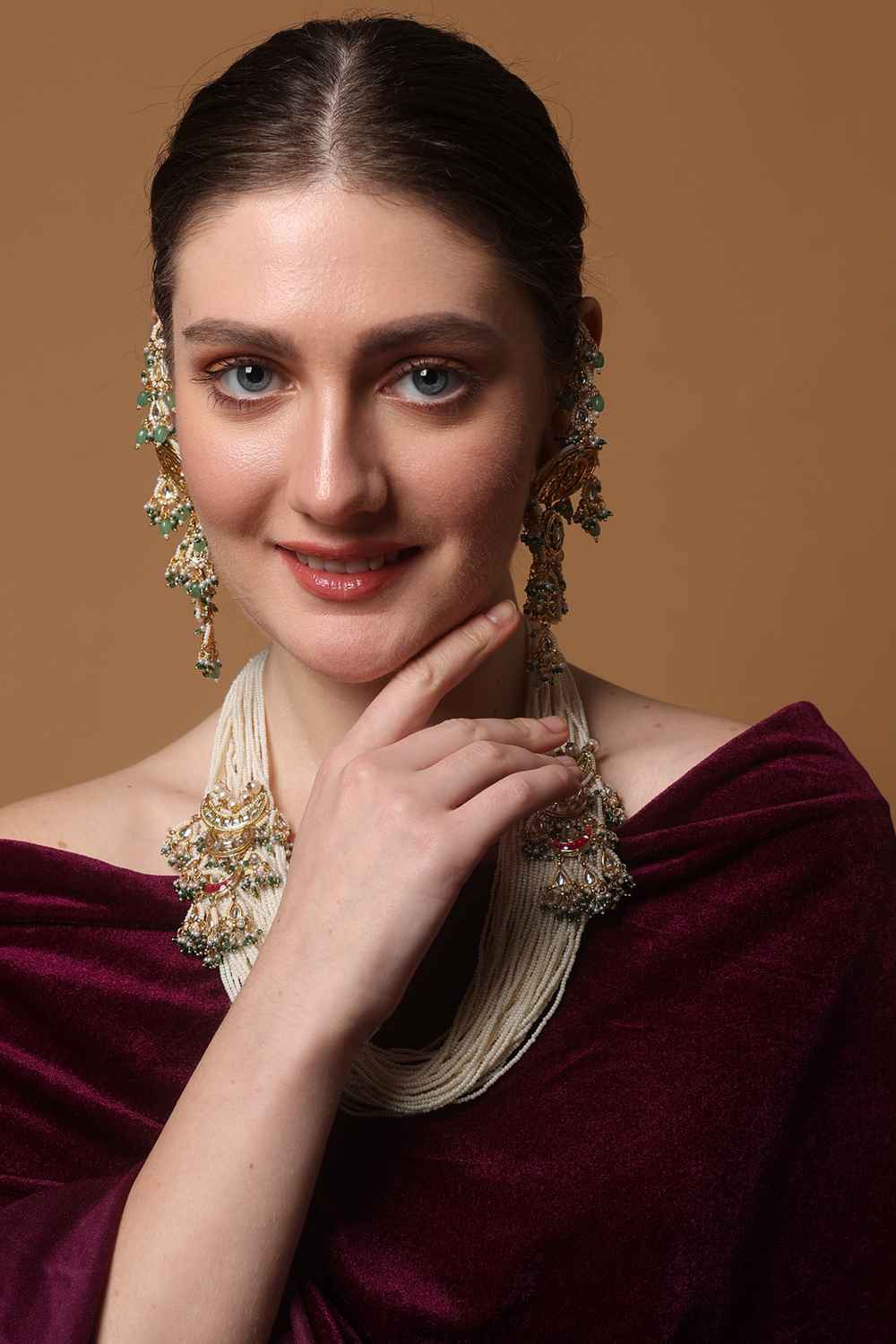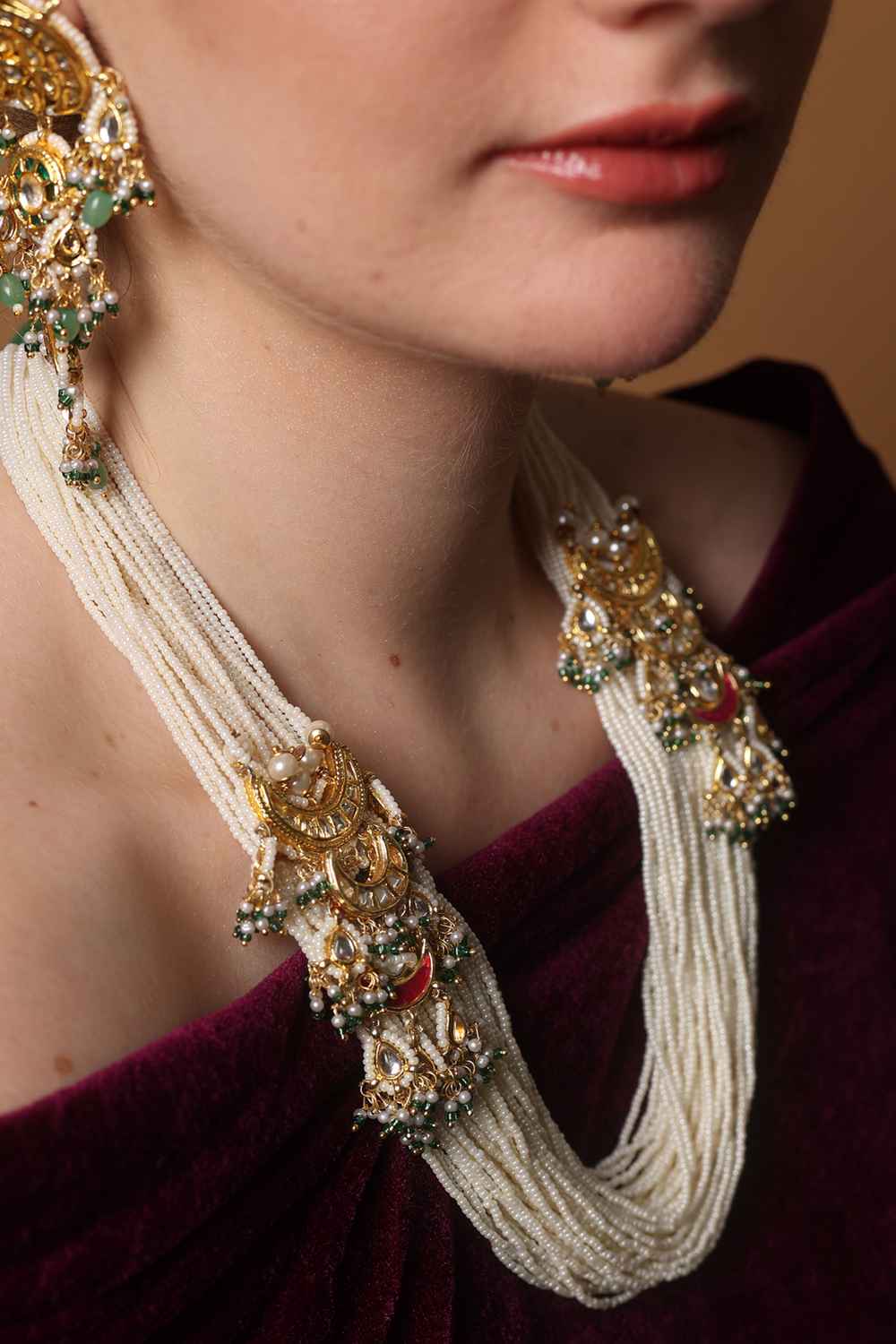 Unveil your inner diva with our Haar Necklace a masterpiece that combines artistry and sophistication. Made from Alloy this jewelry is adorned with Kundan, Pearls, Natural Stones, Faux Emerald ensuring a dazzling finish. Whether you're dressing up for Party or adding flair to casual wear, this piece is your ultimate style companion. Pair it with modern accessories to complete your outfit and make every moment sparkle