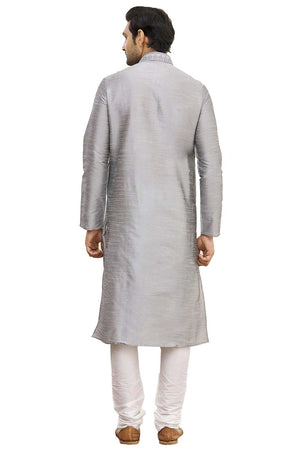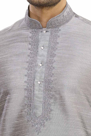 Men's Grey Cotton Embroidered Full Sleeve Kurta Churidar - 46