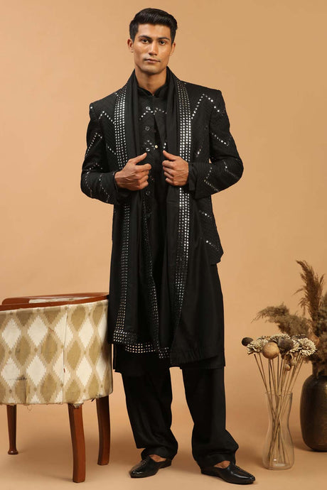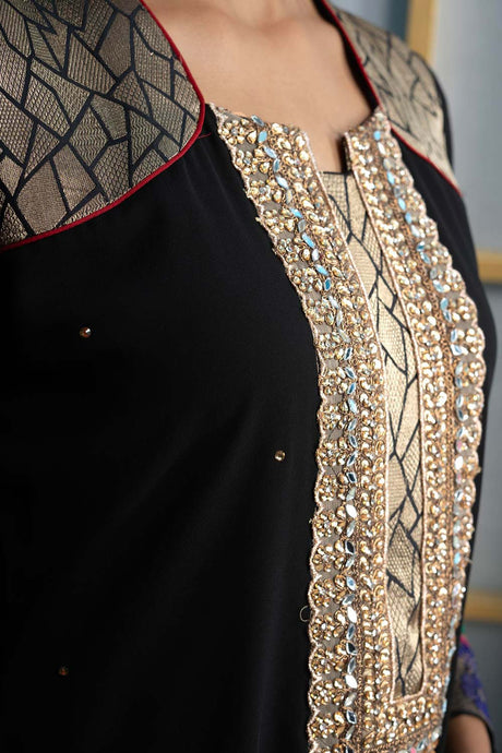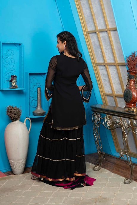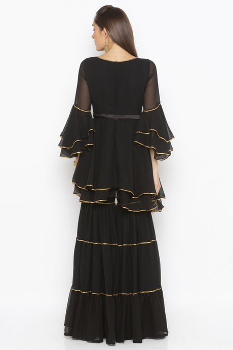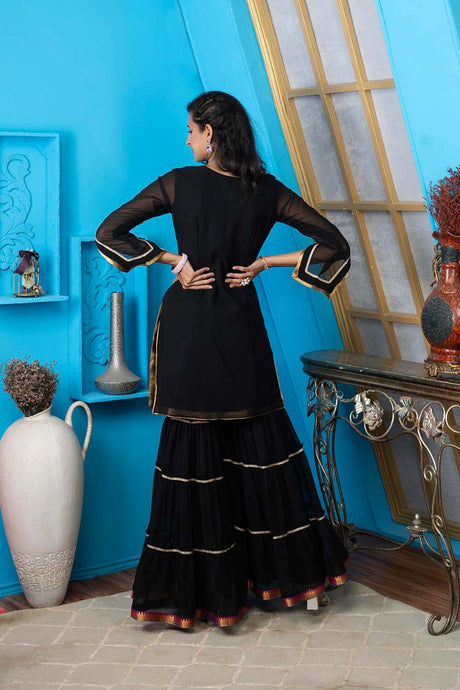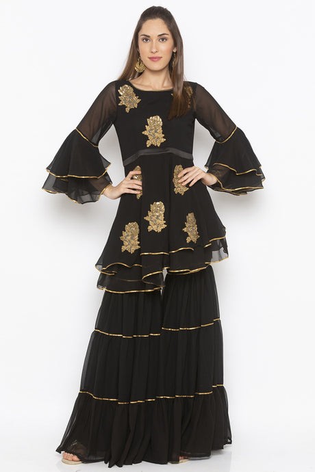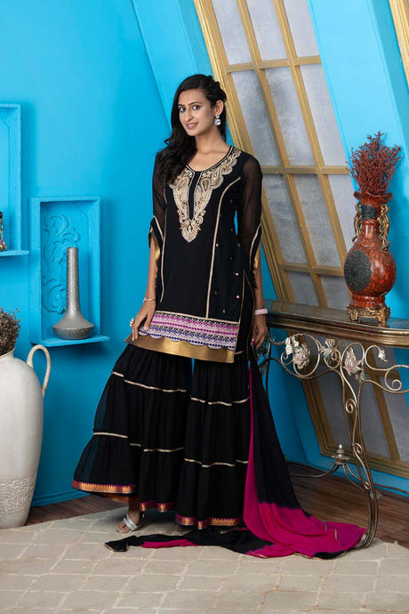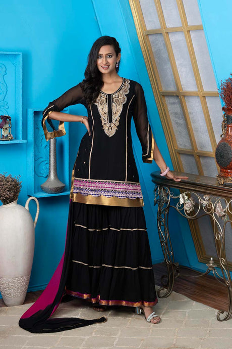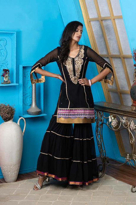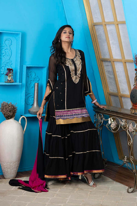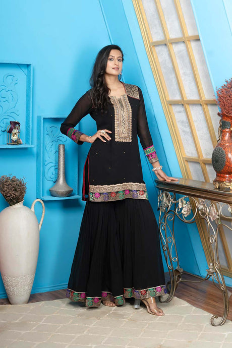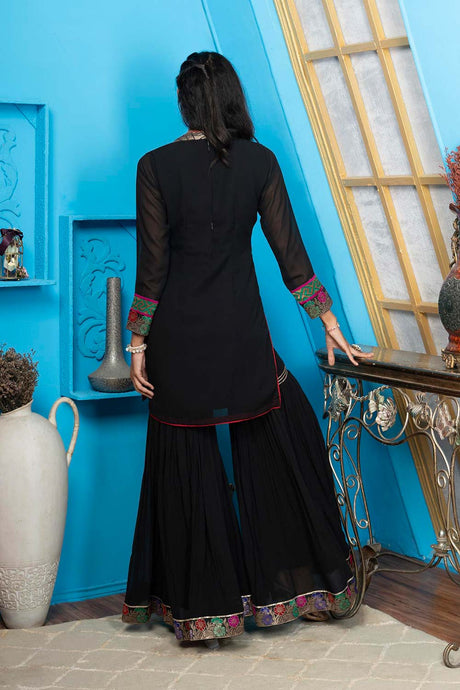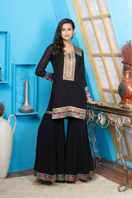 Black Embroidered Georgette Straight Cut Sharara Suit Set