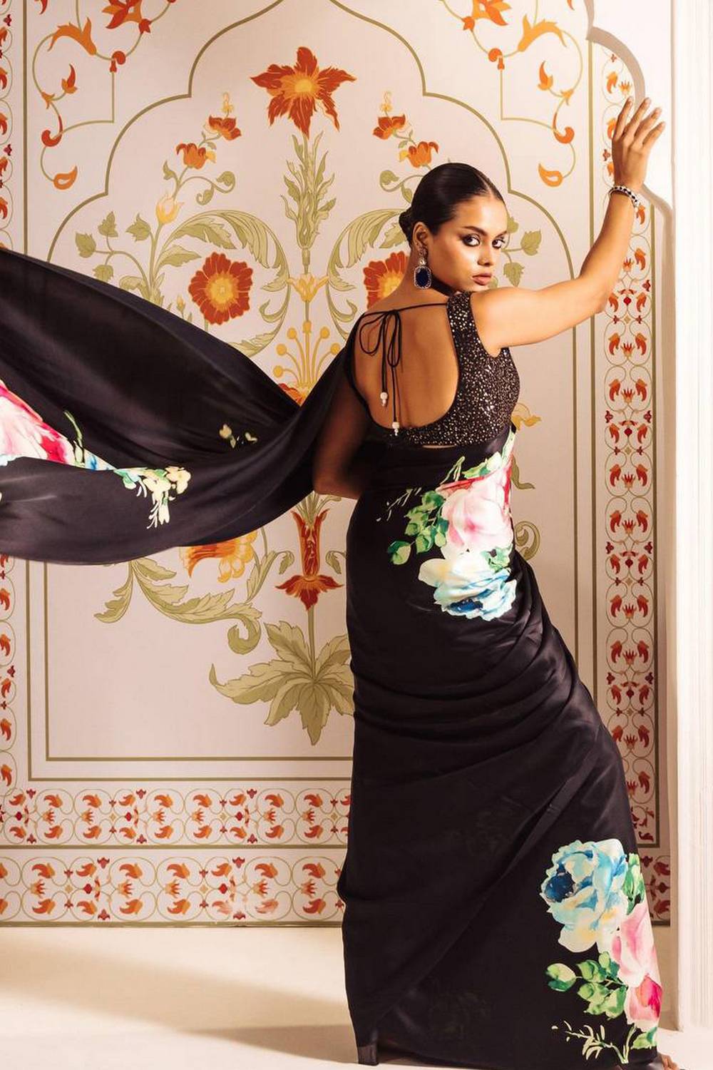 Elevate your wardrobe with our exquisite Saree a masterpiece crafted to add timeless elegance to your style. Made from Satin this saree offers a perfect mix of comfort and sophistication. Adorned with Floral Printed it showcases intricate craftsmanship that speaks volumes of tradition and artistry. Perfect for Casual this saree is a versatile addition to your collection, ensuring you stand out effortlessly. Pair it with elegant Jewelry, for a glamorous look. Add Clutches or Potli Bags and complete the ensemble with Wedges & Heels , making it a perfect choice for any event. Make a statement and embrace the elegance of Saree Today