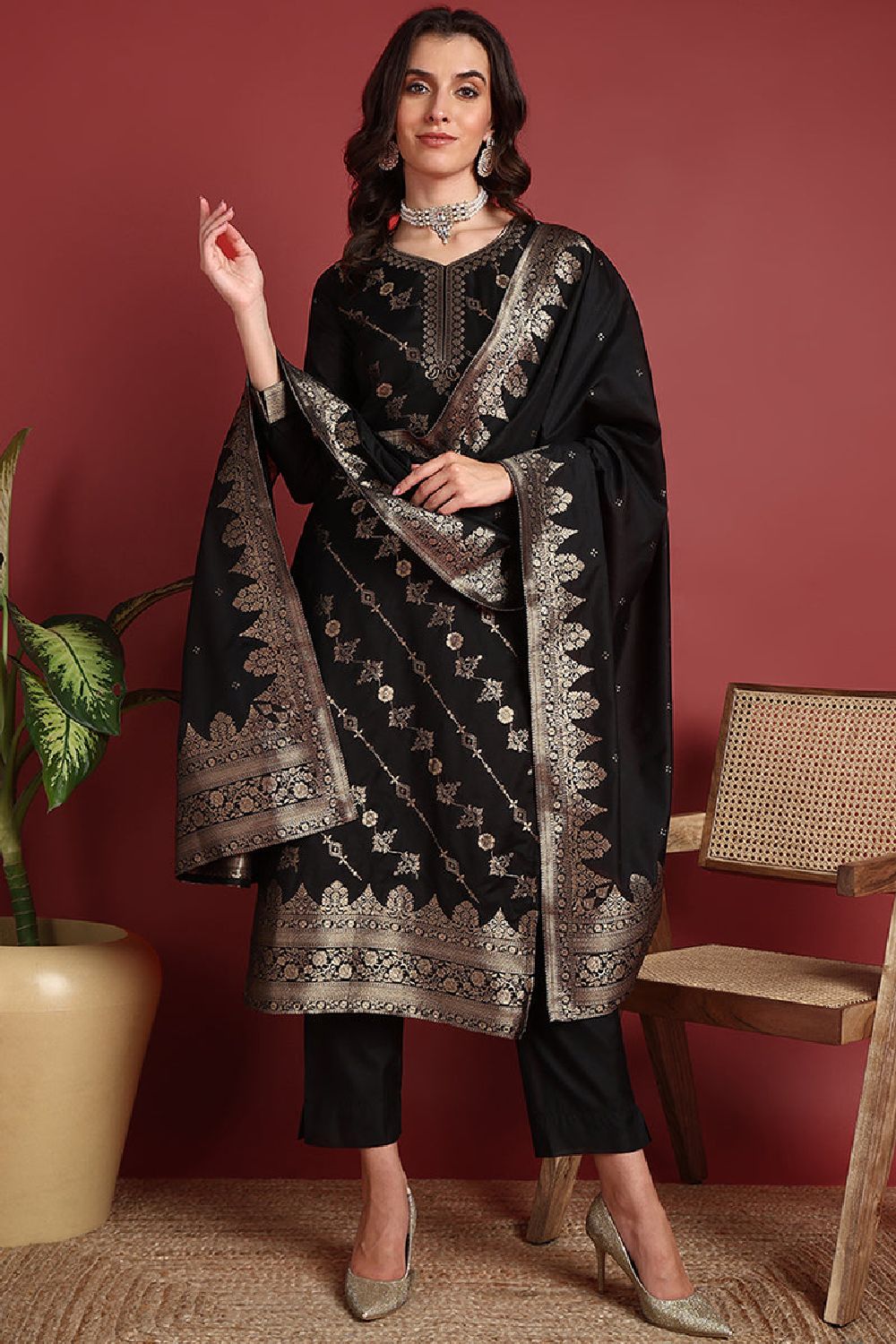 Black Silk Blend Ethnic Motifs Woven Design Straight Cut Suit Set