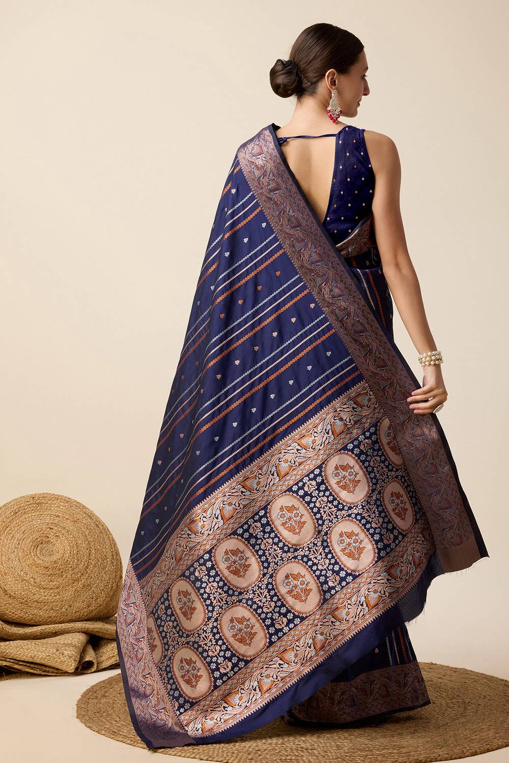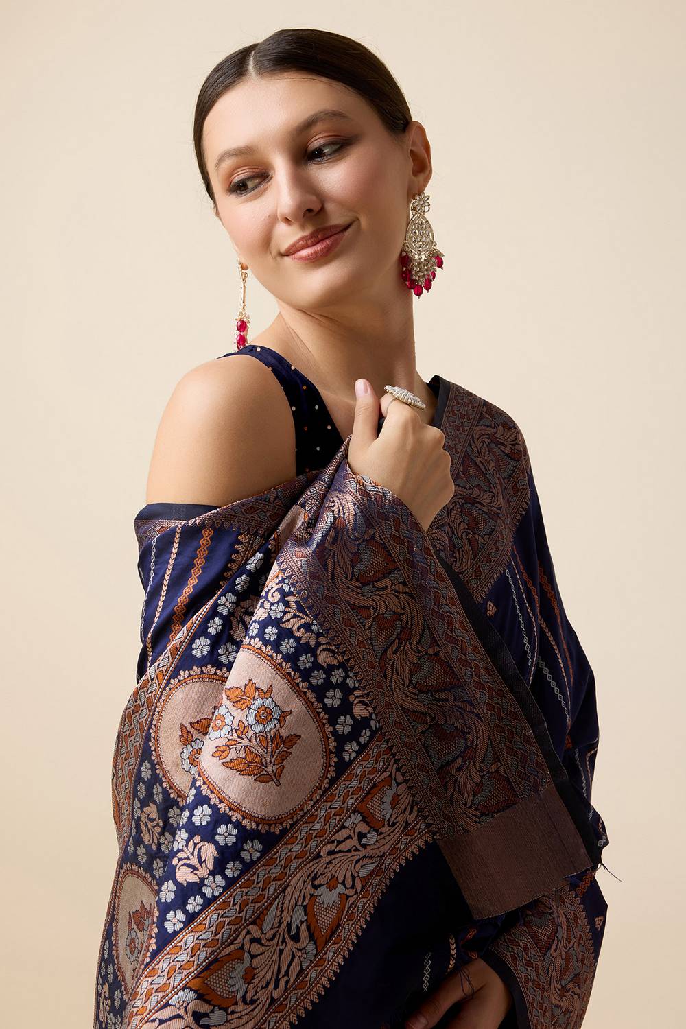Elevate your wardrobe with our exquisite Saree a masterpiece crafted to add timeless elegance to your style. Made from Jacquard this saree offers a perfect mix of comfort and sophistication. Adorned with Woven it showcases intricate craftsmanship that speaks volumes of tradition and artistry. Perfect for Festive this saree is a versatile addition to your collection, ensuring you stand out effortlessly. Pair it with elegant Jewelry, for a glamorous look. Add Clutches or Potli Bags and complete the ensemble with Wedges & Heels , making it a perfect choice for any event. Make a statement and embrace the elegance of Saree today