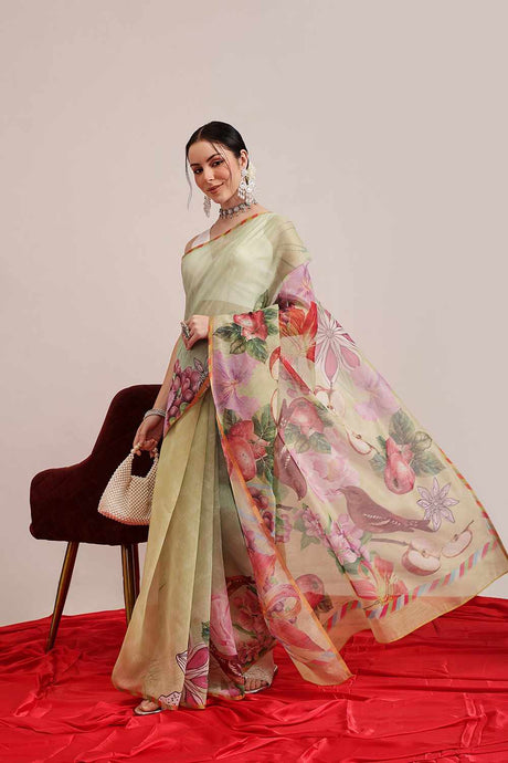 Blue Floral Printed Tissue Silk Saree