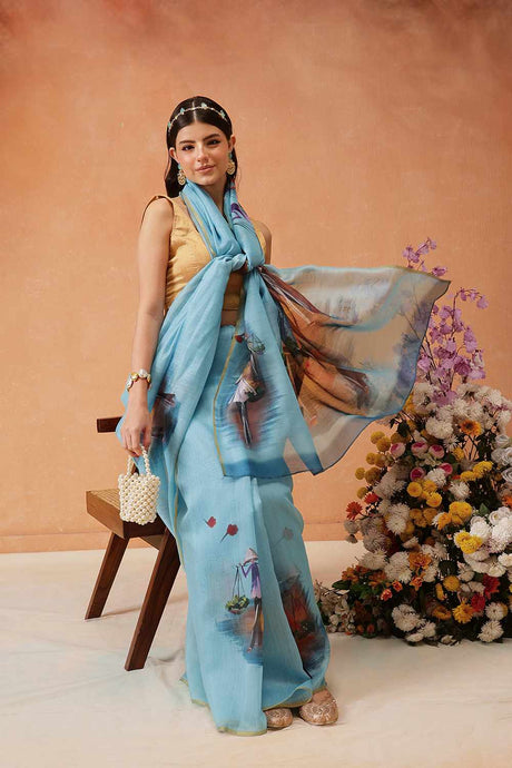 Blue Floral Printed Tissue Saree