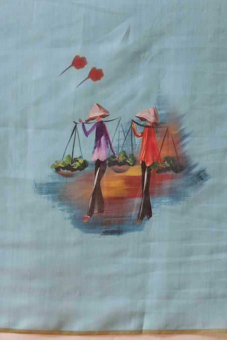 Blue Floral Printed Silk Saree