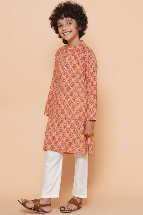 Boy's Orange Laheriya Kurta With Off-White Pajama Set