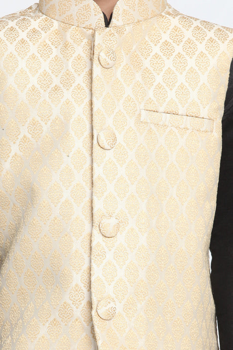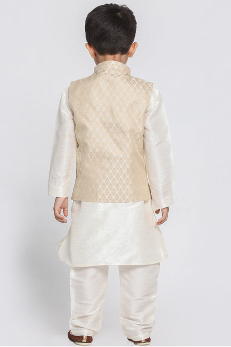 Boys Beige Poly Silk Gold Print Kids Kurta Churidar Set