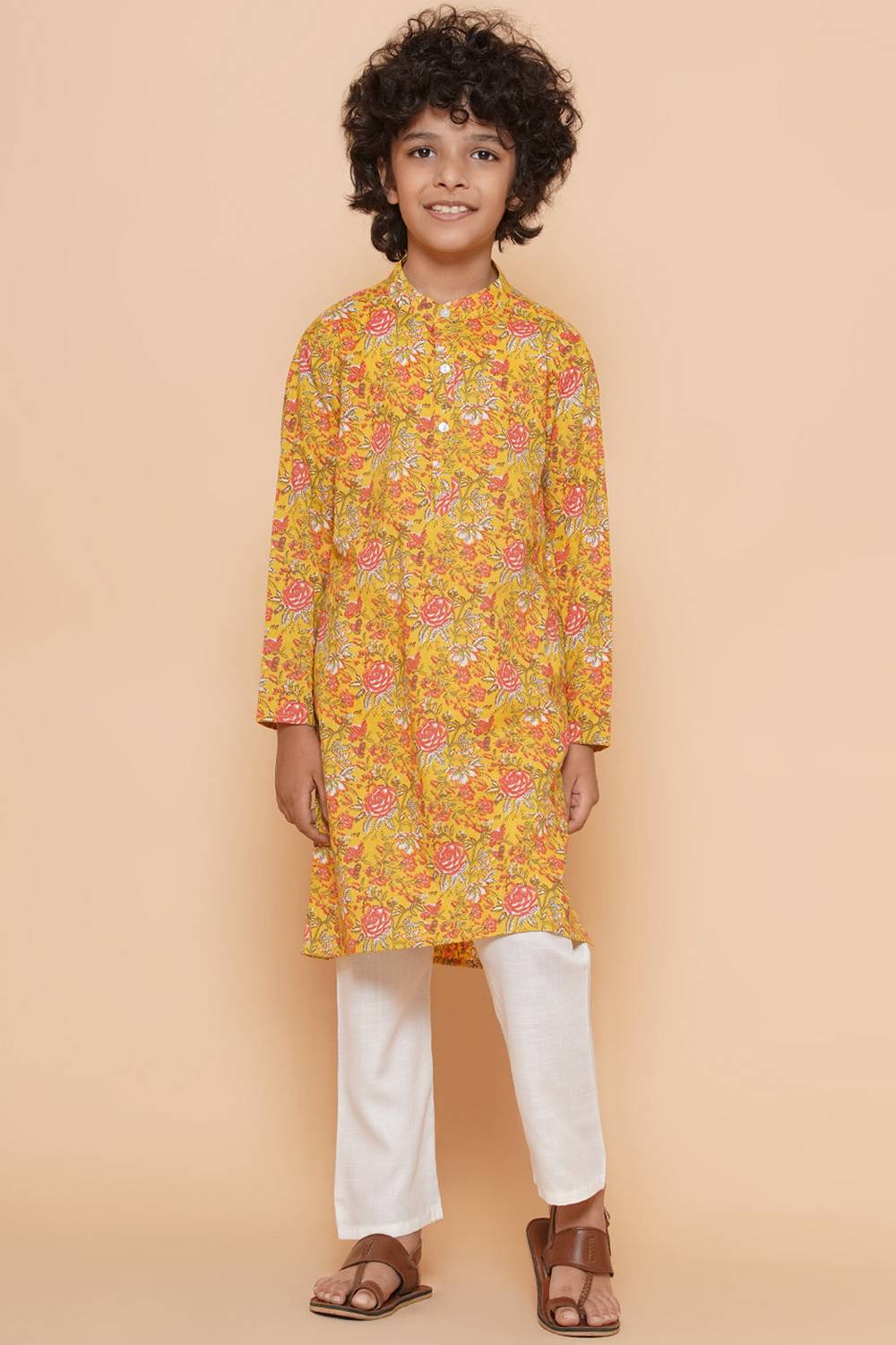 Boy's Mustard Floral Printed Cotton Kurta Set