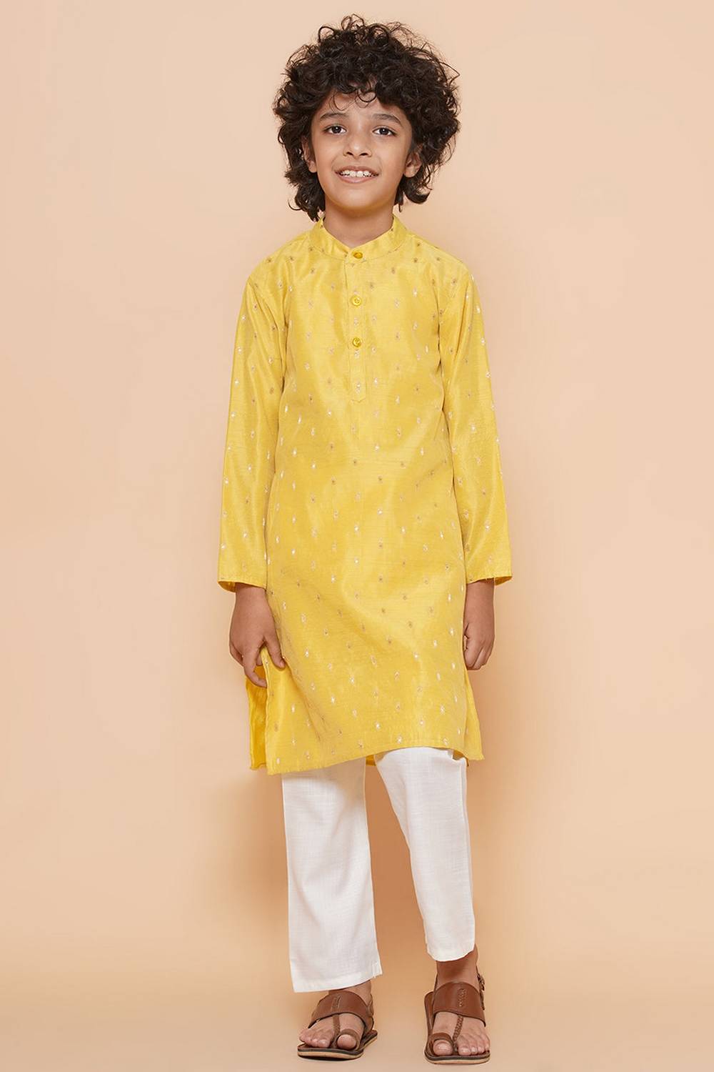 Boy's Yellow Woven Silk Kurta Set