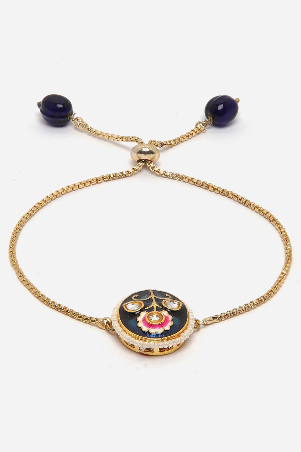 Blue And Gold Adjustable Bracelet With Kundan And Pearls
