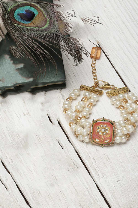 Gold And White Adjustable Bracelet With Kundan And Pearls