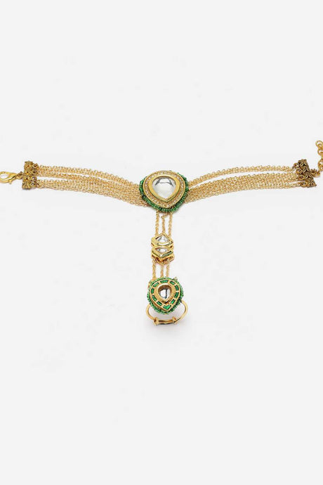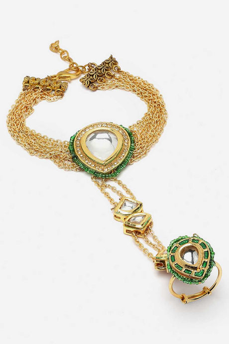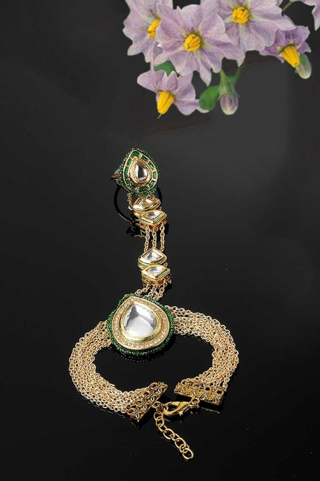 Green And Gold Adjustable Hathphool With Kundan And American Diamonds