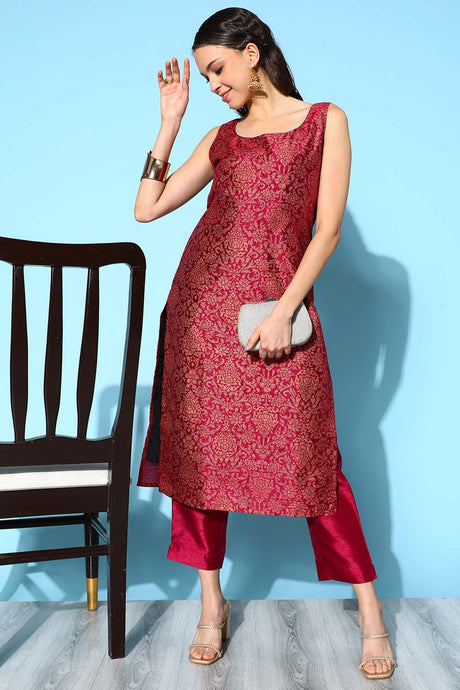 Women's Maroon Silk Blend Printed Kurti Pant Set