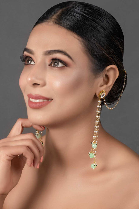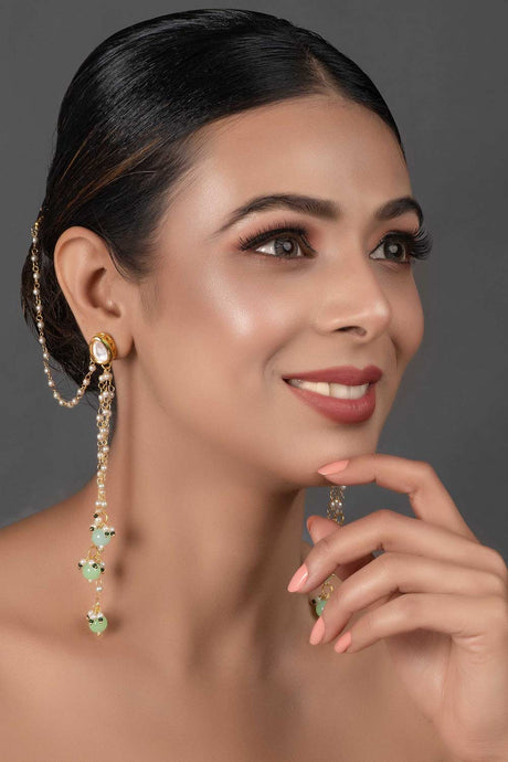 Green And Gold Jhumkas Earring With Kundan And Pearls