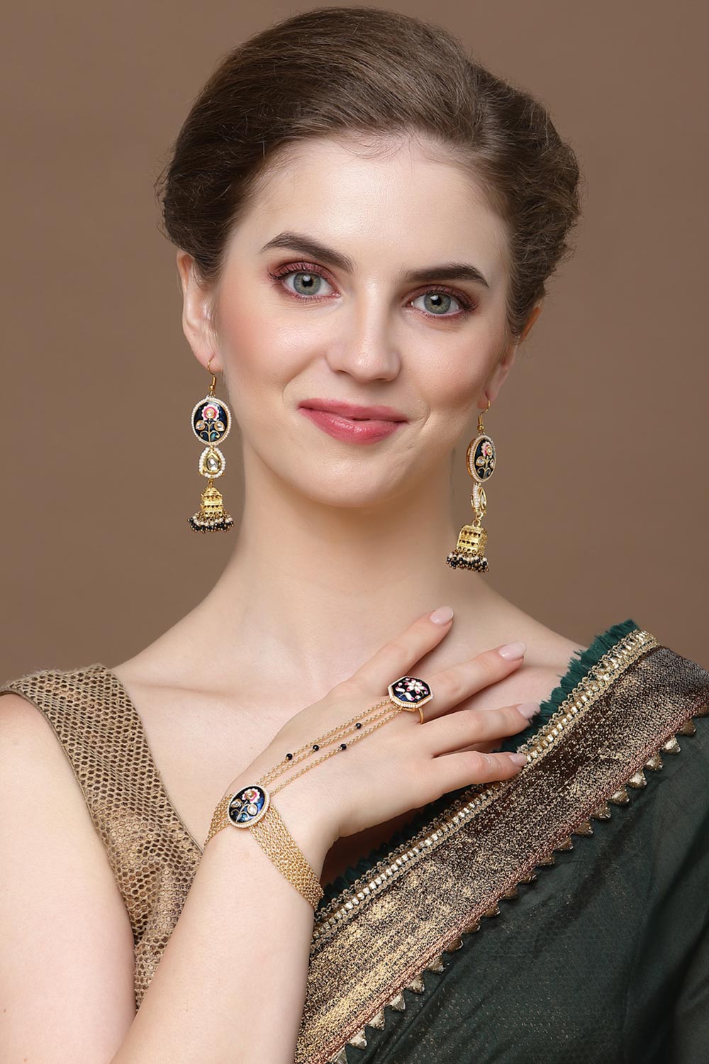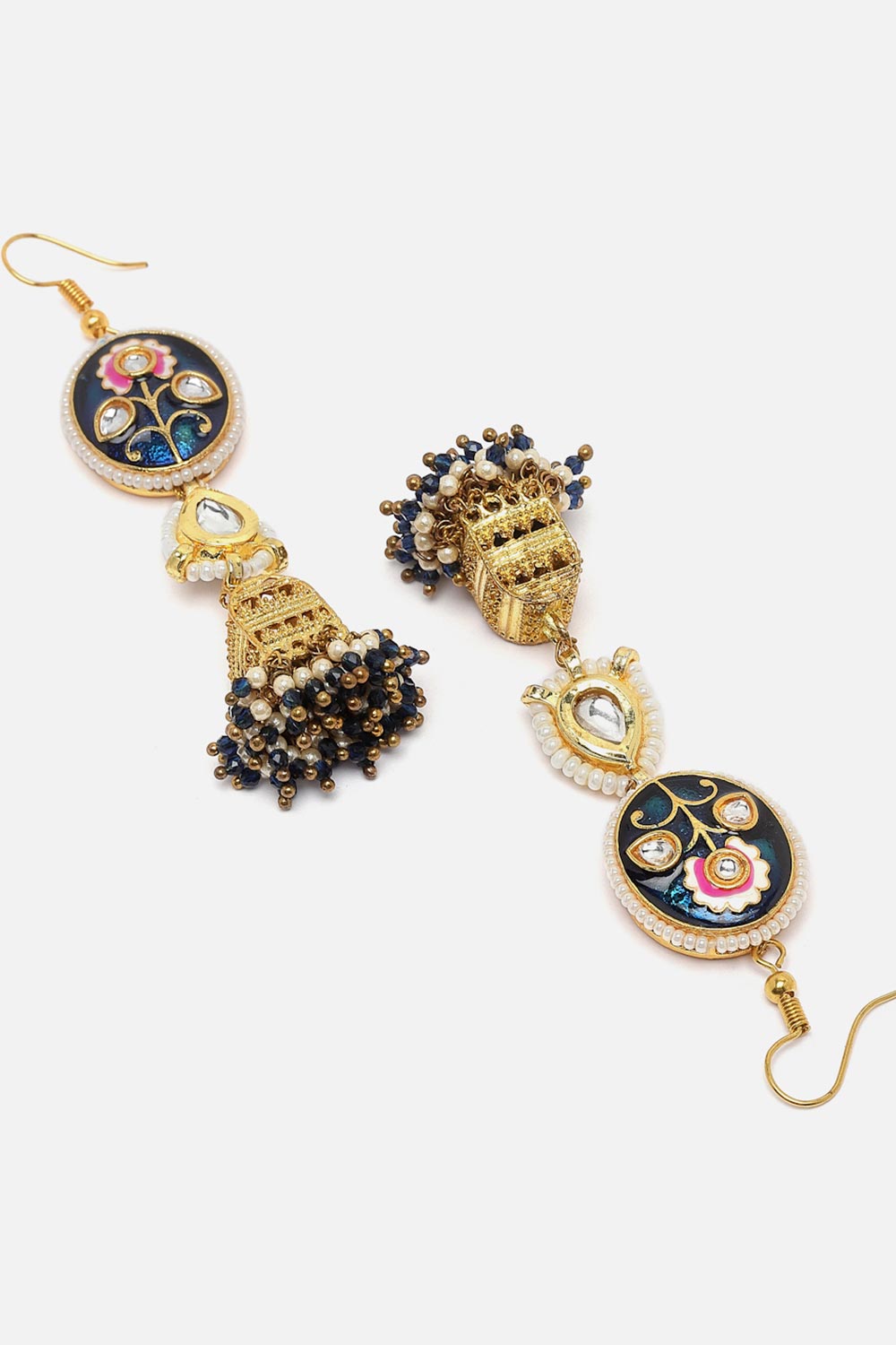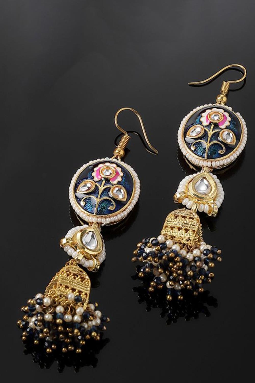 Blue And Gold Jhumkas Earring With Kundan And Pearls