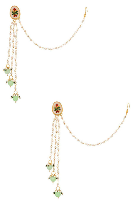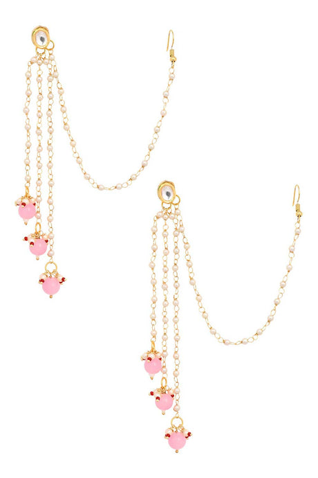 Gold Tone Kundan Inspired Pearl Tassel Earrings With Hair Chain