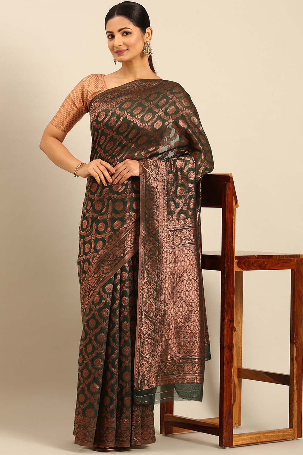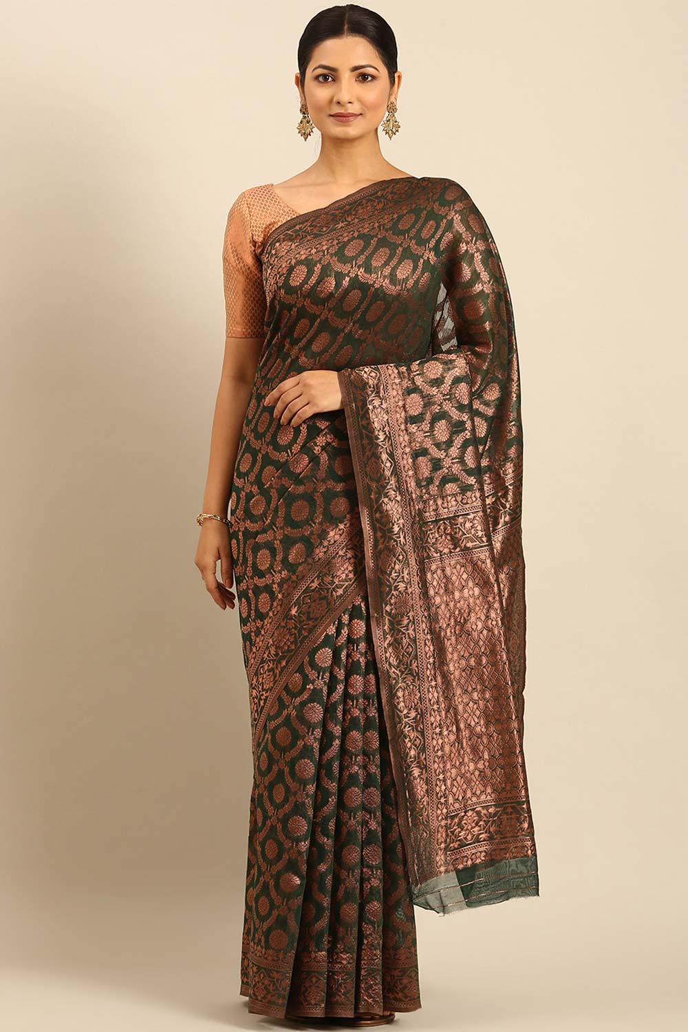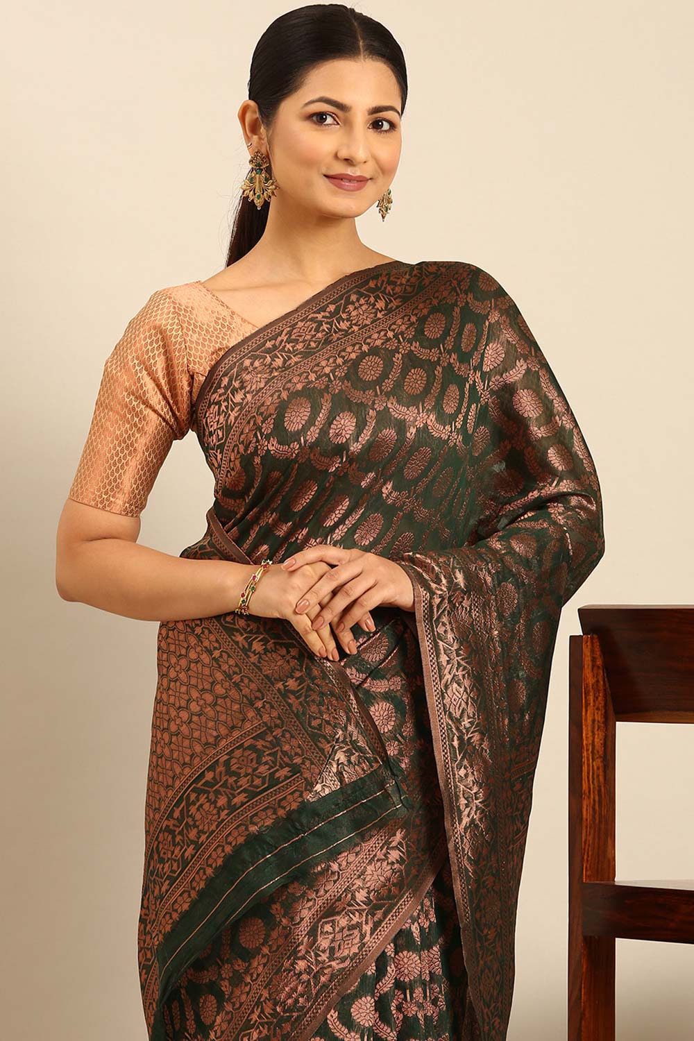 This dark green cotton woven saree is a captivating blend of elegance and sophistication. The deep green hue evokes a sense of tranquility and richness, making it perfect for both formal occasions and casual gatherings.