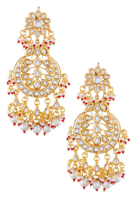 Red And White Gold-Plated Kundan And Pearls Chandbali Earring