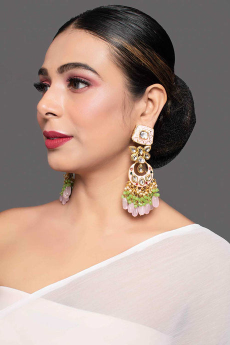 Gold Toned Pink Green Beaded Kundan Studded & Enameled Handcrafted Earrings