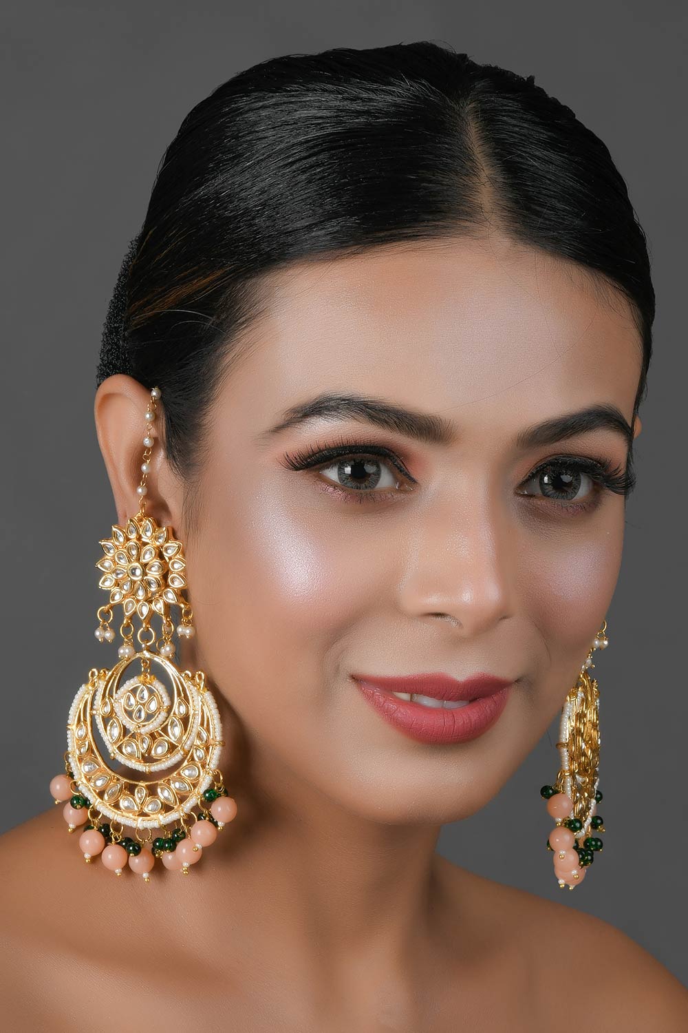 Product Features:- Color: Peach beaded Kundan Chandbali