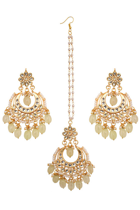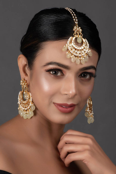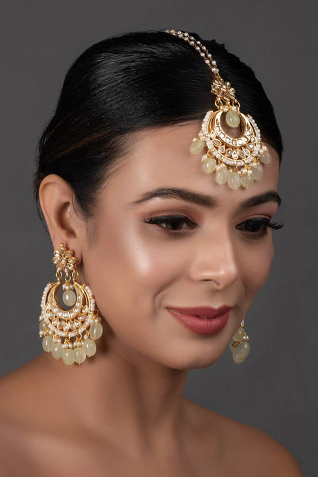 Cream Gold Toned Kundan Inspired Mang Tikka With Chanbali
