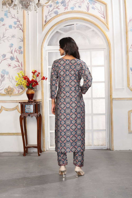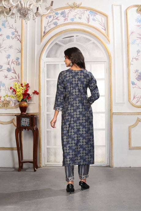 Blue Printed Chanderi Straight Cut Suit Set