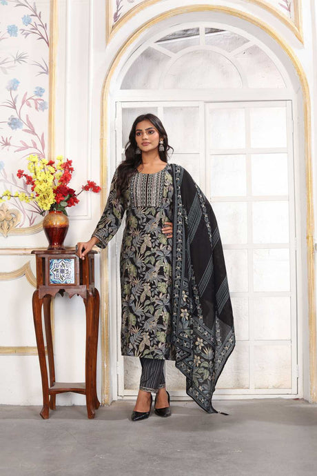 Black Floral Printed Chanderi Straight Cut Suit Set