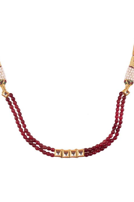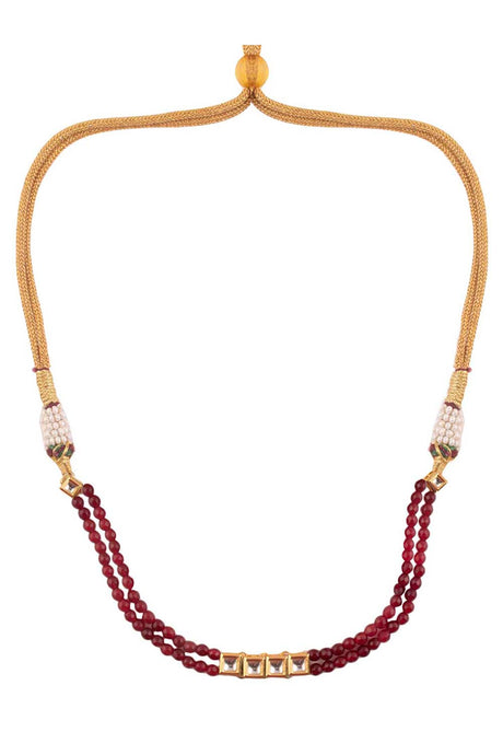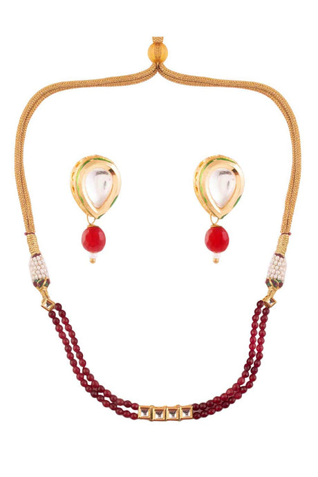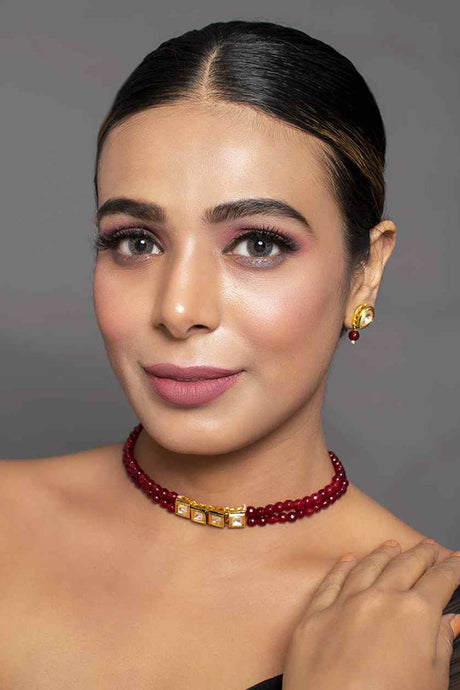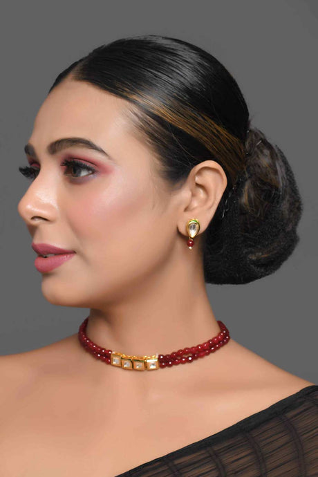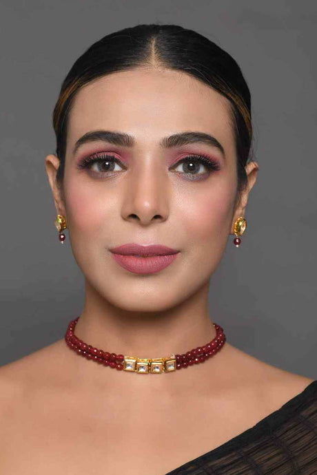 Mahroon Beaded Gold Toned Kundan Inspired Choker With Earrings