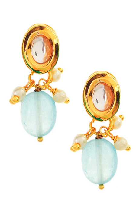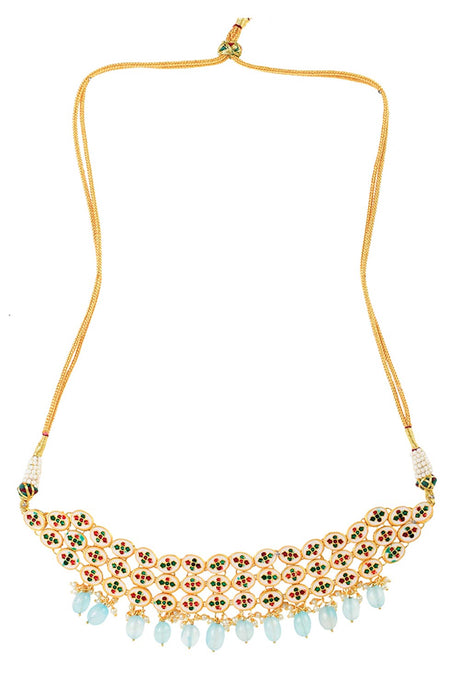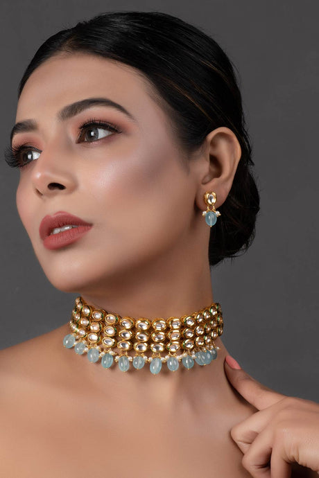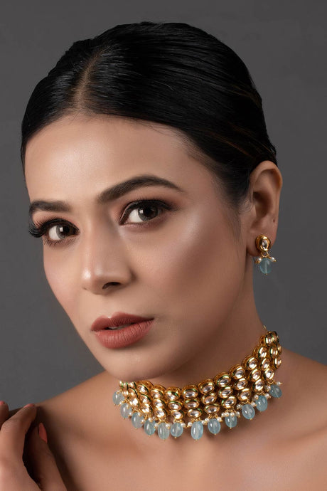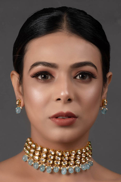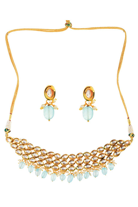 Blue Gold Tone Kundan Beaded Choker Necklace With Earrings