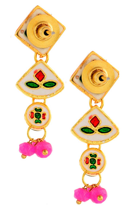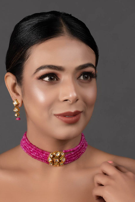 Pink Gold Tone Kundan Beaded Choker Necklace With Earrings
