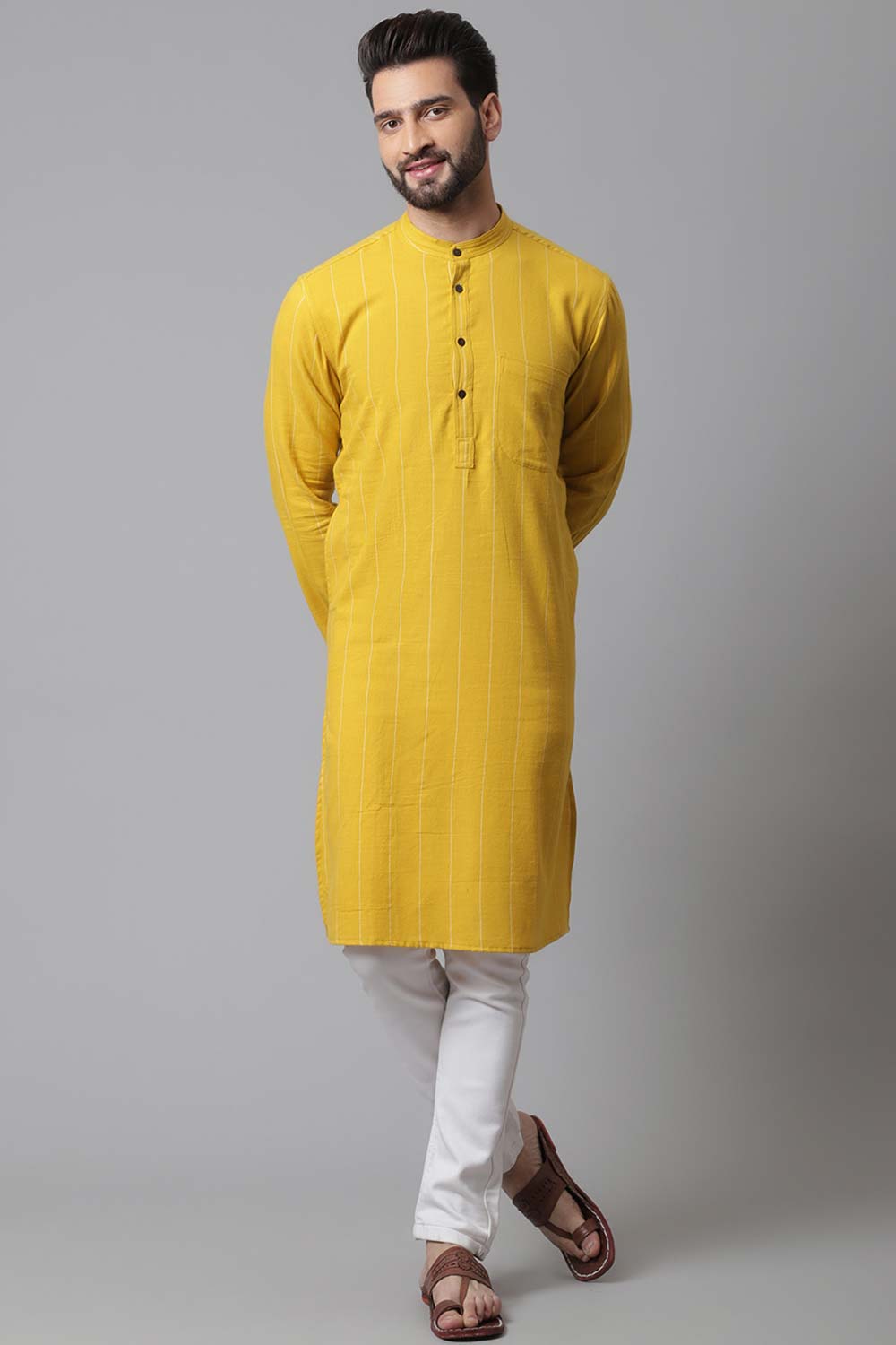 Men's Yellow Linen Stripes Long Kurta