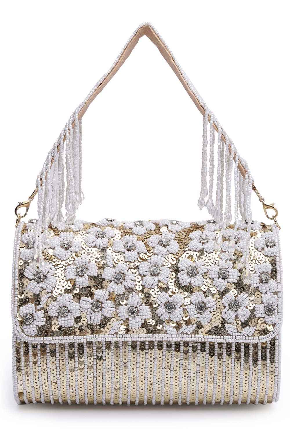Coffer Champagne And White Floral Embellished Faux Silk Clutch