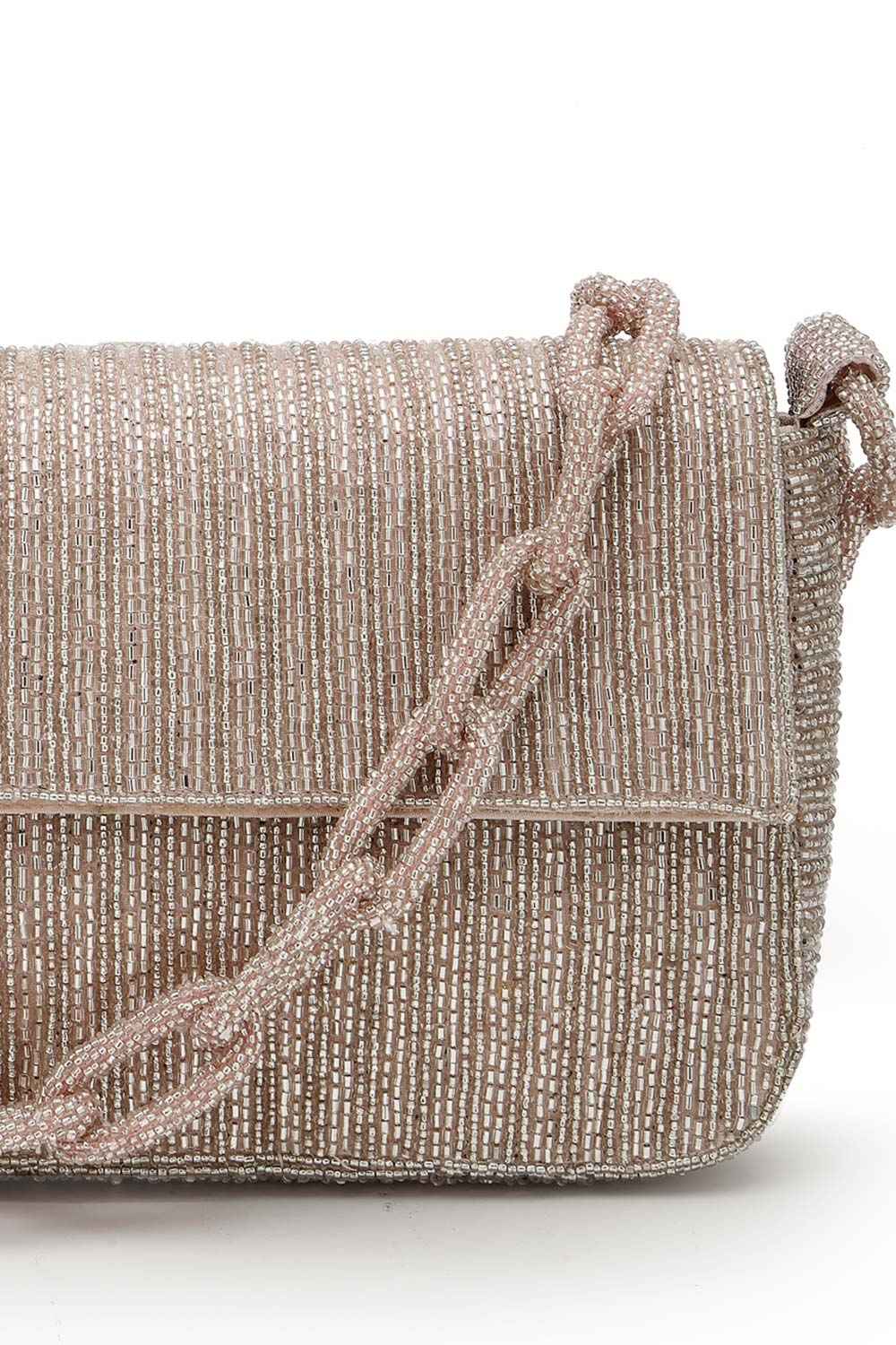 Dusky Pink Clutch from Anekaant's Coffer Collection. This Foldover Clutch is crafted with the finest Faux Silk Fabric and features a Hand Crafted Striped Embellished Pattern. Has a Sturdy and Sequinned Chain shaped Wrist loop. Has one Main Compartment secured with a Magnetic Button Closure. Includes 1 Patch Pocket and offers ample space for all your essentials like a phone, makeup, keys etc. Dimensions (LxHxW): 23 x 15 x 4.5 cm