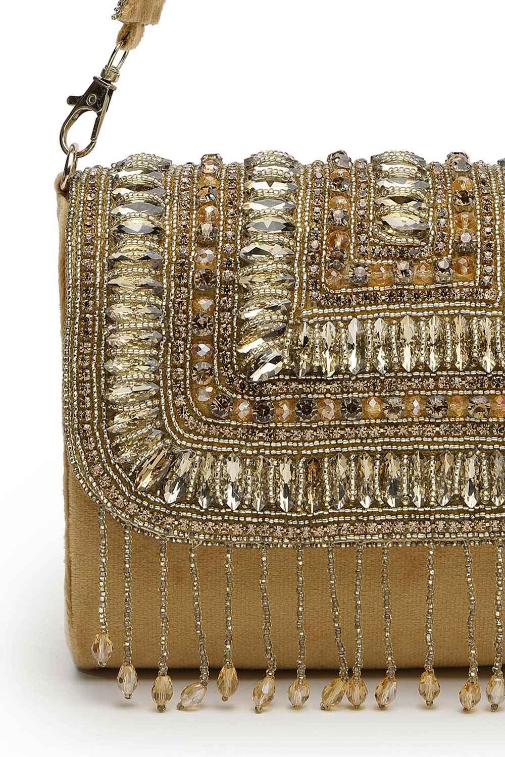 Nude And Gold Clutch from Anekaant's Droop Collection. This Foldover Clutch is crafted with the finest Suede Fabric and features a Hand Crafted Stone Embellished Pattern decorated with Tassels. Has a Sturdy and Detachable Wrist loop. Has one Main Compartment secured with a Magnetic Button Closure. Includes 1 Patch Pocket and offers ample space for all your essentials like a phone, makeup, keys etc. Dimensions (LxHxW): 18 x 14 x 6 cm
