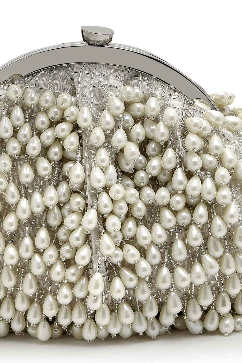 Droop Pearl And Off White Pearl Embellished Faux Silk Clutch