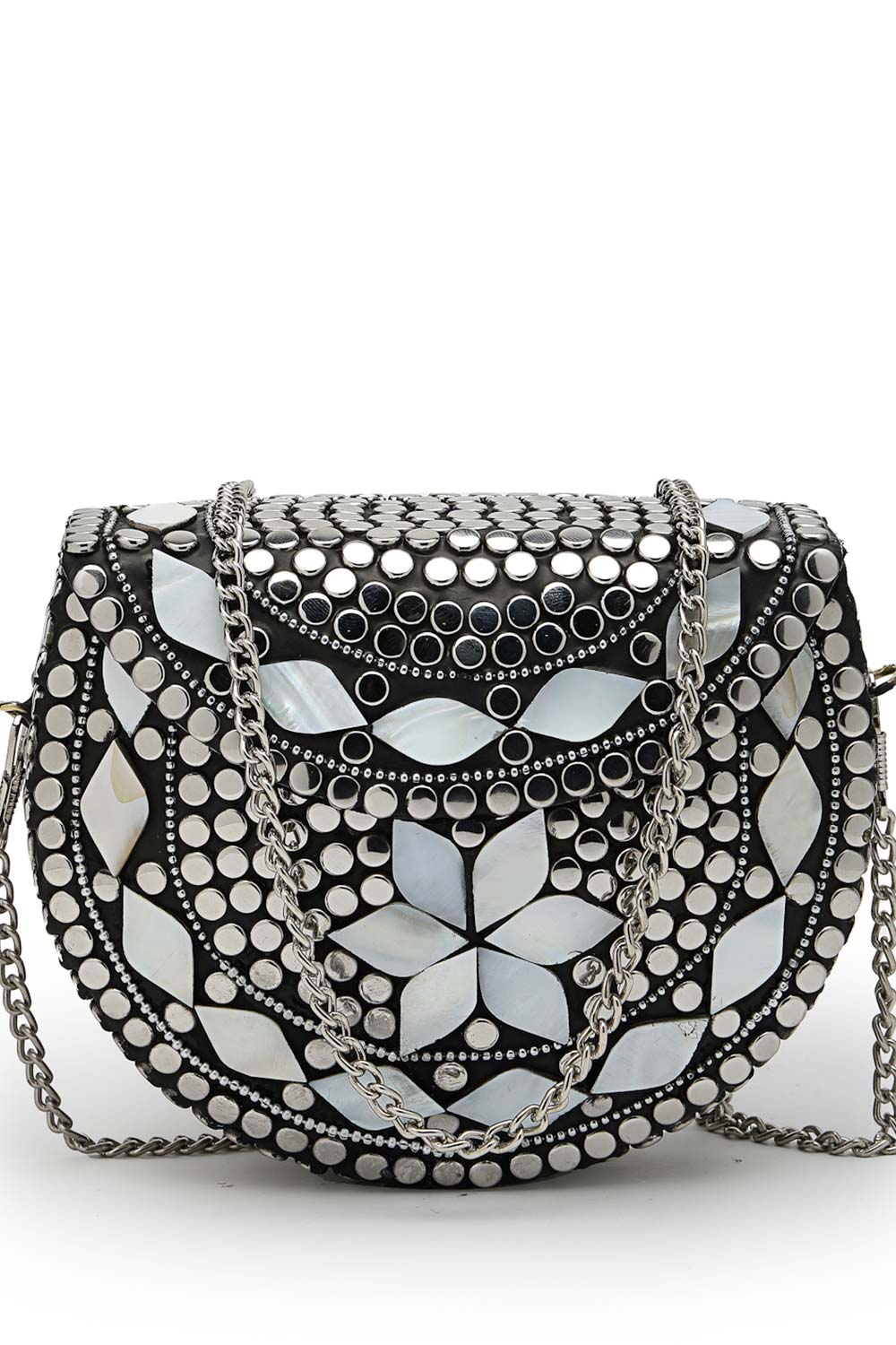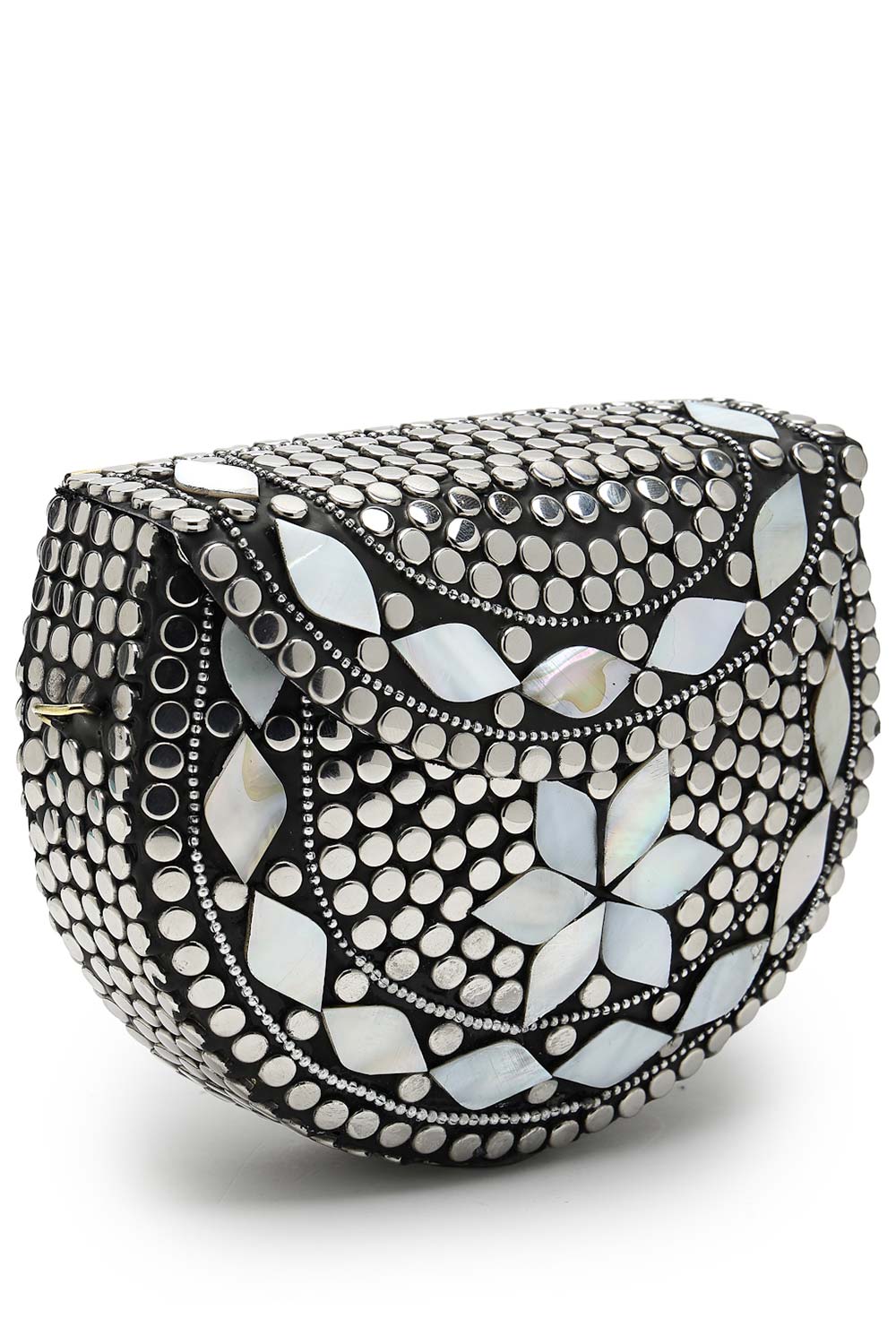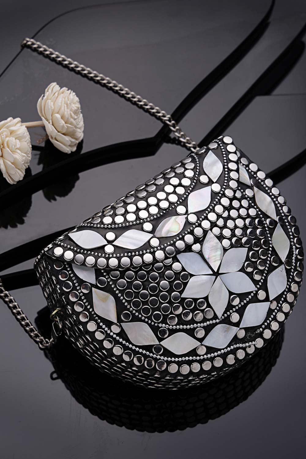 Marble And Silver Clutch from Anekaant's Mosaic Collection. This Mini Halfmoon Clutch is crafted in Metal and features a Hand Crafted Mosaic Embellished Pattern. Has a Sturdy and Detachable Chain Shoulder Strap. Has one Main Compartment secured with a Click Closure. Great accessory for young girls or women who want to carry something very small. Dimensions (LxHxW): 13 x 11 x 3 cm