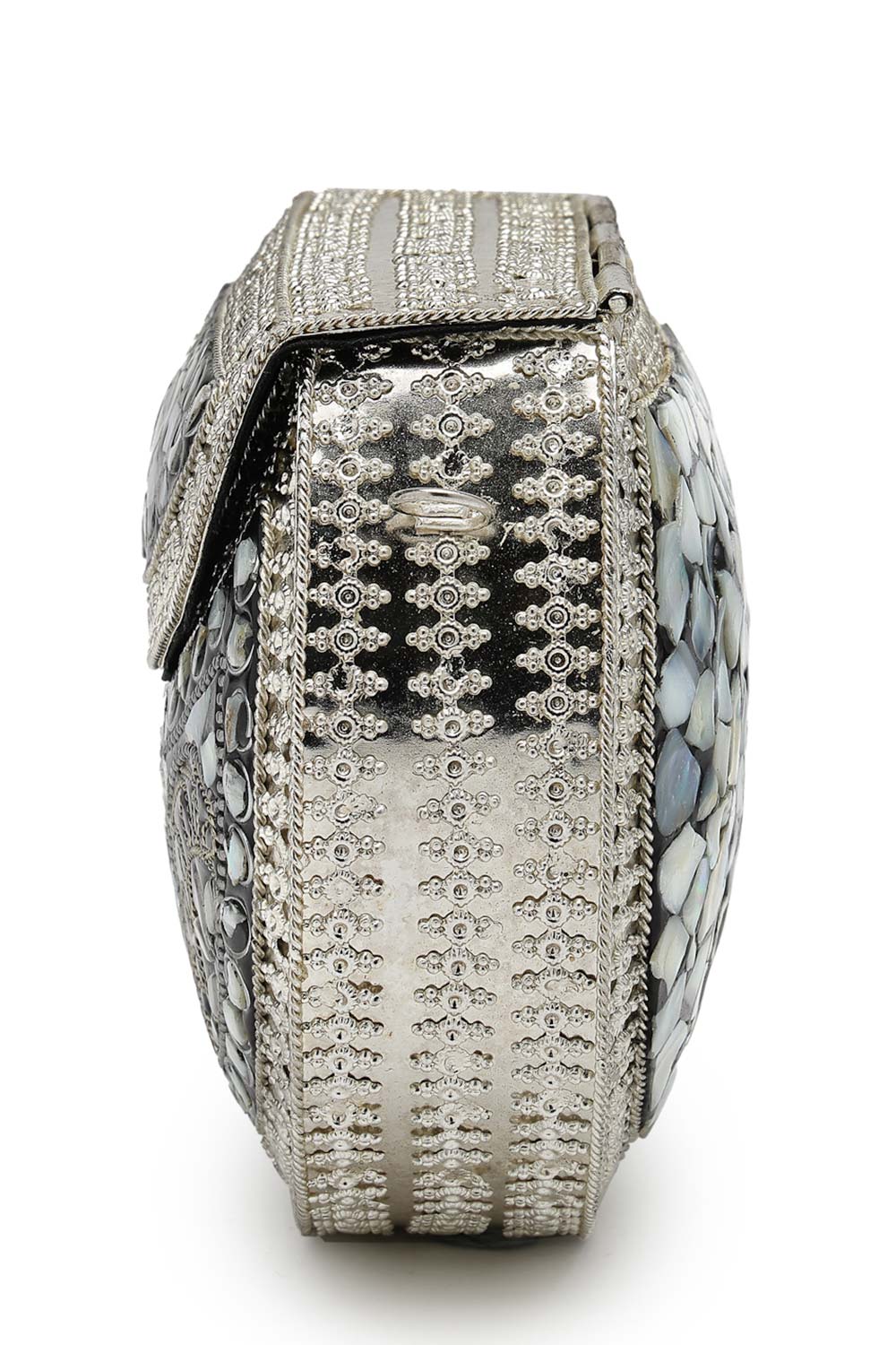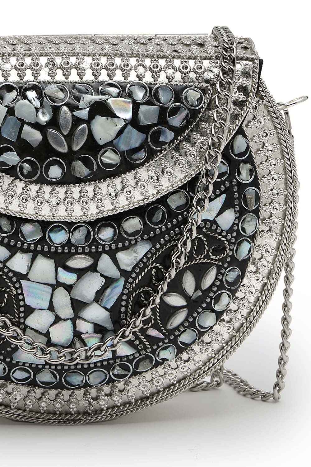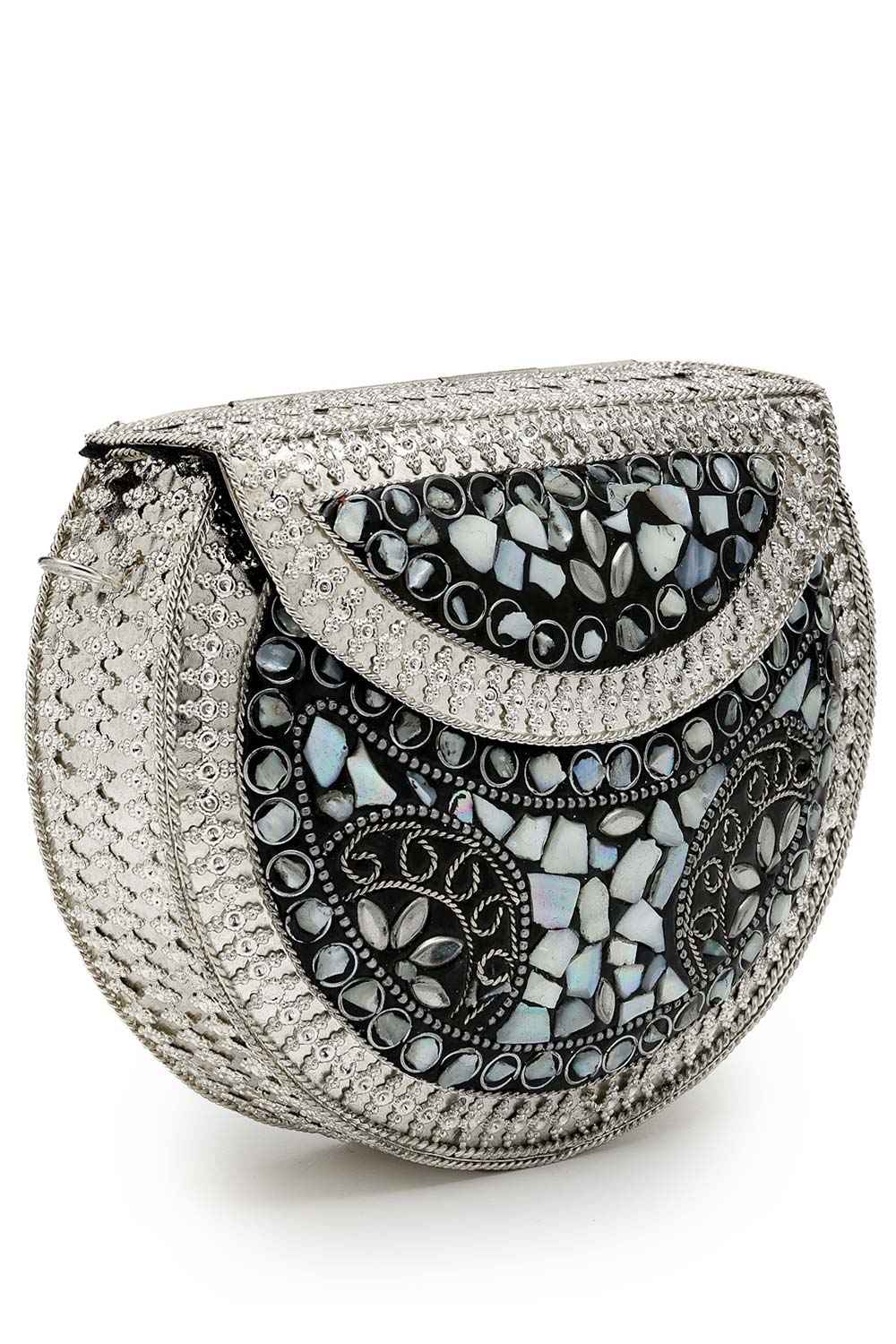Marble And Silver Clutch from Anekaant's Mosaic Collection. This Mini Halfmoon Clutch is crafted in Metal and features a Hand Crafted Mosaic Embellished Pattern. Has a Sturdy and Detachable Chain Shoulder Strap. Has one Main Compartment secured with a Click Closure. Great accessory for young girls or women who want to carry something very small. Dimensions (LxHxW): 13 x 11 x 3 cm
