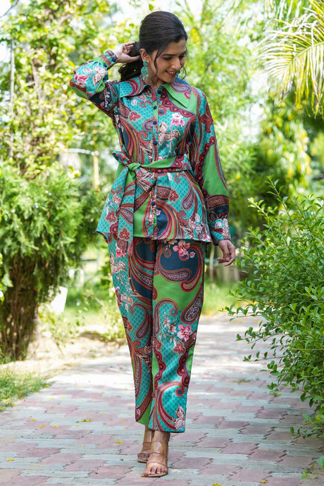 Green Polyester Printed Straight Round Neck Co-Ord Set