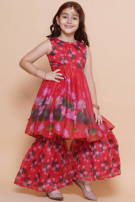 Girl's Blue Floral Printed Pleated Kurta With Skirt