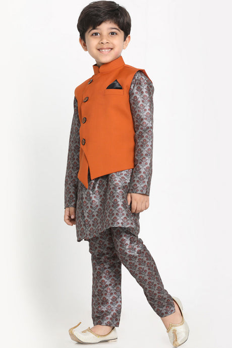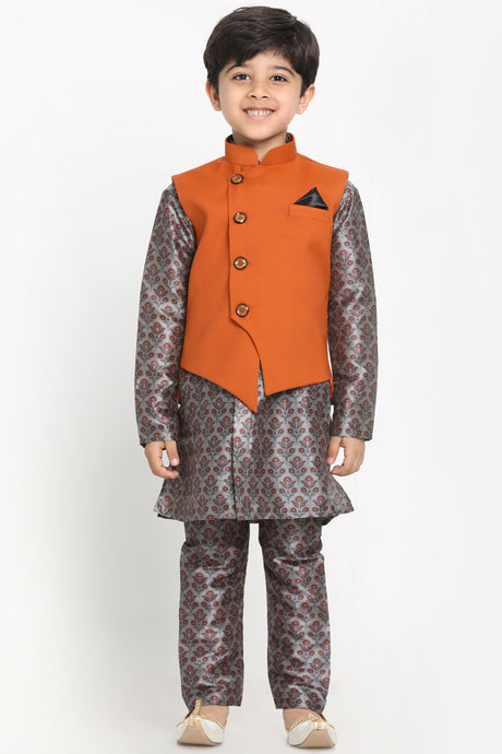 Boys Beige Poly Silk Gold Print Kids Kurta Churidar Set